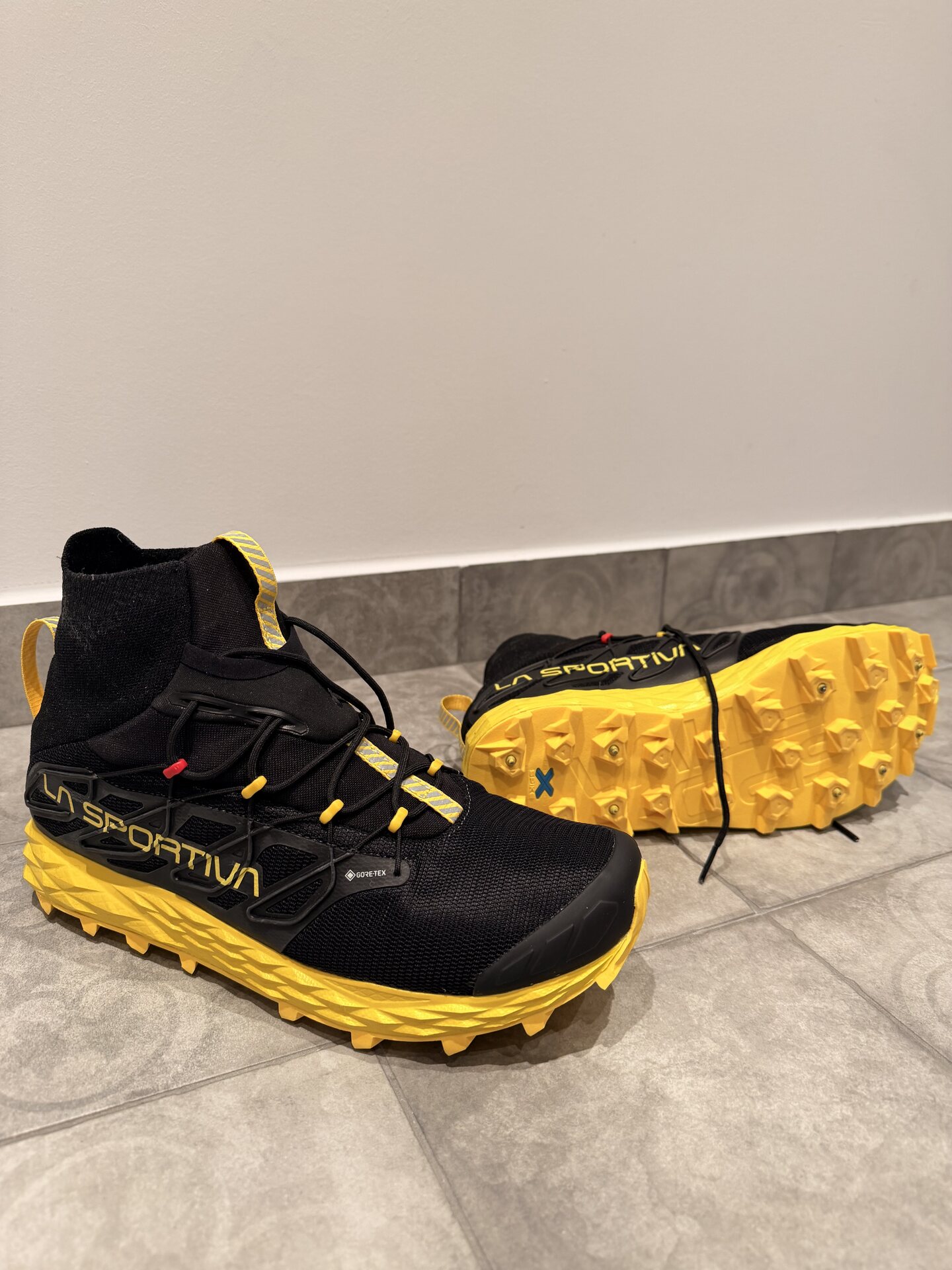 Зимна обувка за бягане от водоустойчив Gore-Tex® с водоотблъскваща гета и интегрирани AT Grip Fixed Spikes за максимално сцепление.