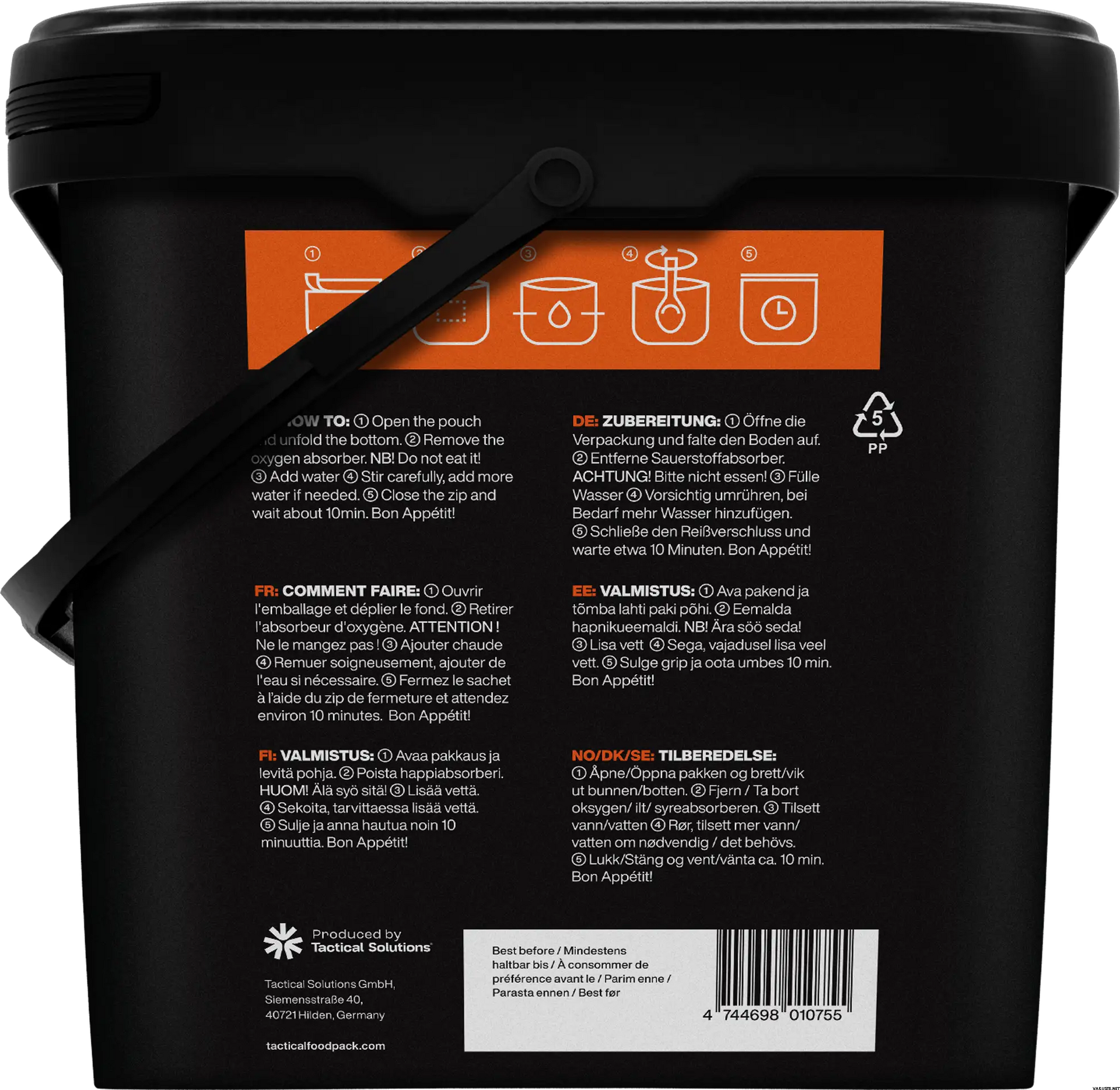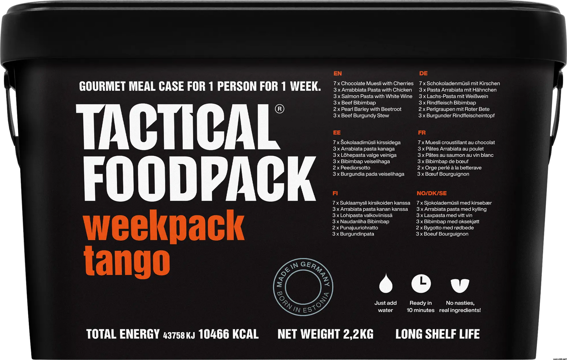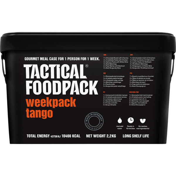 Gurmánské pouzdro na jídlo Tactical Foodpack Weekpack Tango je nezbytným společníkem pro ty, kteří se vydávají na týdenní outdoorová dobrodružství nebo kempování. Toto balení obsahuje 21 jídel a poskytuje pohodlné a výživné řešení pro občerstvení v divočině nebo horách. Je navrženo pro všestrannost a lze jej také skladovat doma jako spolehlivou nouzovou zásobu potravin. Každé jídlo se rychle připravuje pouhým přidáním horké nebo studené vody, takže je ideální pro situace, kdy ohřev vody není možný. Při přípravě jídla se studenou vodou zdvojnásobte dobu namáčení. Lyofilizovaná jídla si zachovávají svou nutriční hodnotu a mají dlouhou trvanlivost, takže budete dobře připraveni na jakoukoli situaci.