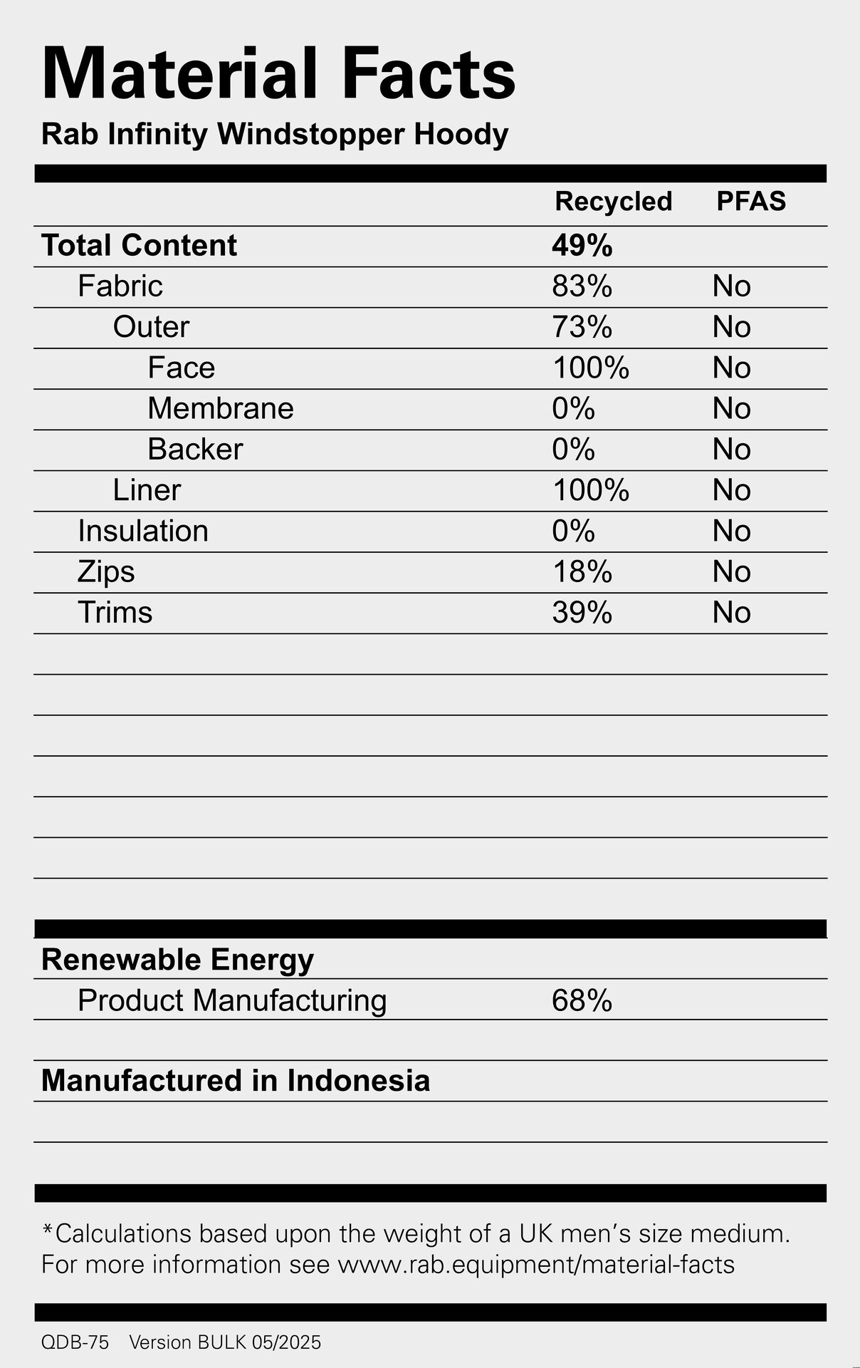 Hlavní materiál: 30D Windstopper od Gore-Tex Labs s úpravou DWR bez uhlovodíků
