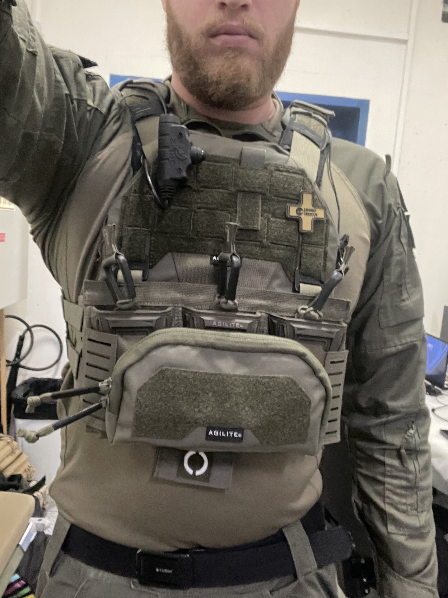 • Agilite Pincer Placard™ er et elastisk plakat med krogrygge, der rummer tre 5.56 magasiner. Dets revolutionerende, patentanmeldte magwell-design giver dig mulighed for at gribe eller genindeksere et magasin med kun én hånd, mens du stadig bevarer en solid fastholdelse, så dine magasiner aldrig falder ud.