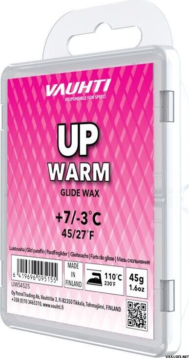 Vauhti Up Warm Pink 45g +7…-3 er et topvalg for aktive langrendsløbere og konkurrenceløbere, der søger optimal glid under varmere forhold. Denne solide glidevoks er designet til temperaturer fra +7 til -3 °C og tilbyder fremragende ydeevne og holdbarhed på sne ved højere temperaturer. Fremstillet af kulbrinteingredienser af høj kvalitet, zinkstearat og silikonevoks, sikrer den overlegen glid og langvarig effektivitet. Ved påføring anbefales det at stryge voksen ved 110 °C.
