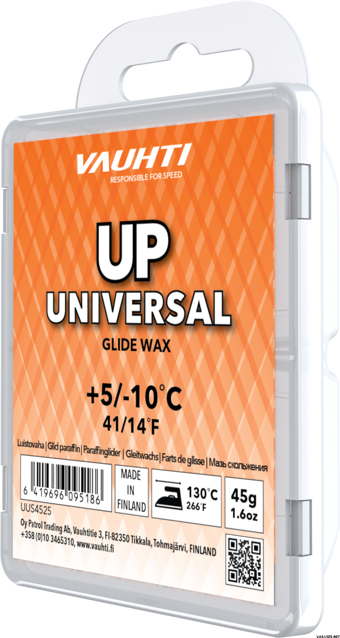 Vauhti Up Universal Orange 45g +5…-10 Glide Wax er fremstillet til skiløbere, der kræver høj ydeevne under træningssessioner. Denne glidevoks er perfekt til både aktive og konkurrenceskiløbere og tilbyder en jævn og effektiv glidning på sneen. Dens formel indeholder førsteklasses kulbrinteingredienser, zinkstearat og siliciumvoks, hvilket ikke kun sikrer fremragende ydeevne, men også imponerende holdbarhed.