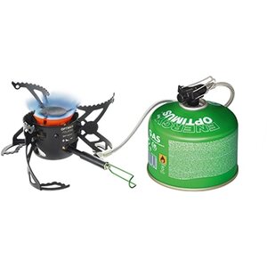 ONE JET – ANY FUEL. The Optimus Polaris Optifuel is the new benchmark for maximum versatility and ease of use in outdoor cooking. With its single jet technology it delivers excellent cooking performance with LPG Gas, White Gas, Kerosene, Diesel and Jet Fuel without having to change anything on the stove. The patented quick-priming burner, the self purging aluminium pump and a built in magnetic cleaning needle ensure reliability and ease of use when liquid fuels are used. When using LPG gas, you can switch between efficiency mode and 4 season mode (for usage at low ambient temperatures) by simply opening the integrated support legs and turning the canister upside down. Including 0.4 liter fuel bottle.