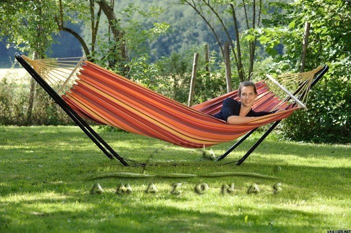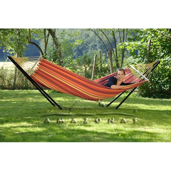 Complete set at a sensible price. Black powder-coated frame and matching hammock in the colour `Vulcano´. `Click´ fixing allows rapid erection and space saving when stored. A set for everone.