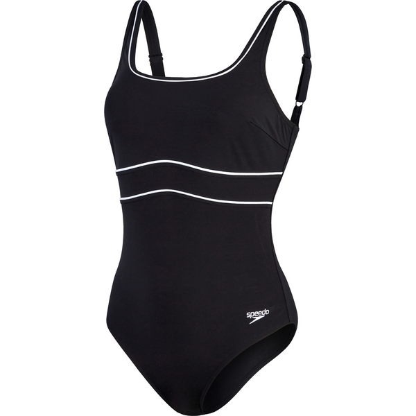 Der Speedo Shaping ContourEclipse Badeanzug für Damen wurde entworfen, um Ihre Figur zu betonen und zu schmeicheln und gleichzeitig außergewöhnlichen Komfort zu bieten. Dieser sportliche schwarze Badeanzug hat einen quadratischen Ausschnitt und weiße Unterbrustnähte, die die Aufmerksamkeit nach oben lenken und eine schmeichelhafte Silhouette schaffen. Mit mittlerer Brustunterstützung, einem versteckten Brustpolster und verstellbaren Trägern sorgt er für einen sicheren und bequemen Sitz während Ihrer Schwimmeinheiten. Das innovative Eco Shape Comprex-Gewebe bietet eine Ganzkörperformung und besteht aus recycelten Materialien, was es sowohl umweltfreundlich als auch langlebig macht.
