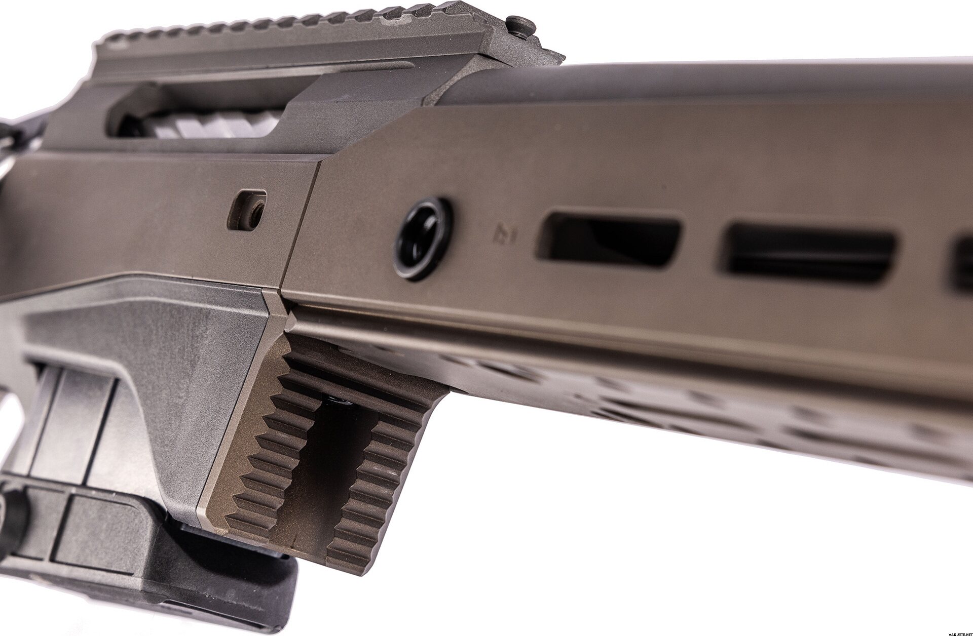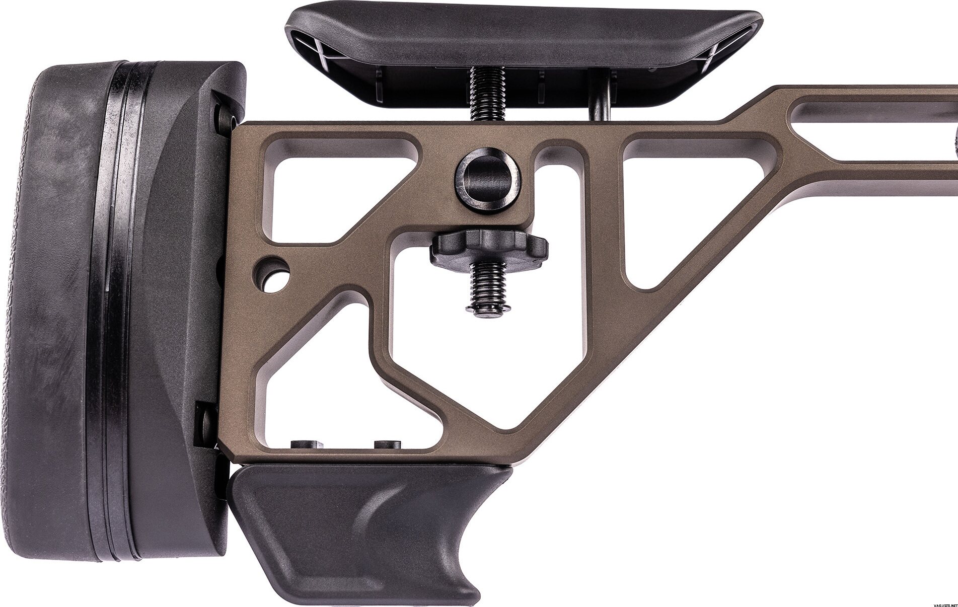 Der verstellbare Schaft des Gewehrs gewährleistet eine komfortable und stabile Schießposition und lässt sich individuell anpassen. Schaftlänge, Wangenauflage und Schaftkappe sind verstellbar. Der skelettierte Hinterschaft ermöglicht die Anbringung von Zusatzgewichten zur Stabilisierung des Gewehrs. Die beidseitig bedienbare, verstellbare Daumenauflage verbessert die Unterstützung der Schusshand, insbesondere beim Schießen aus der Bauchlage. Auch Winkel und Position des Pistolengriffs sind verstellbar, um eine optimale Abzugsposition zu gewährleisten. Der Pistolengriff ist AR-kompatibel und erweitert somit die Anpassungsmöglichkeiten.