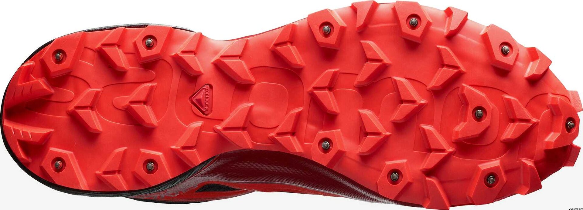 Lug design with deep penetration and multi-directional grip, improving traction on soft surfaces like mud or loose dirt. A protective piece of rubber, leather or synthetic material over the toe area.