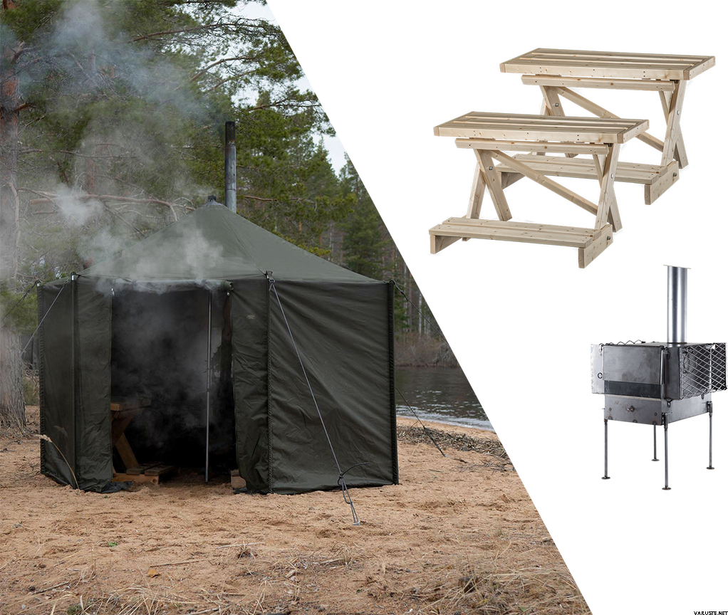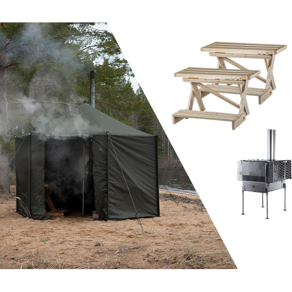 The package includes: the tent itself, six corner poles, one centre pole, six stakes, a stake bag, a bag for the complete tent package. Stove and benches are not included, these are sold separately!
