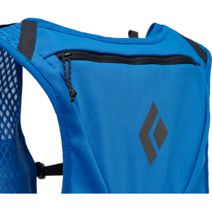 Engineered for long distance races and fast-paced adventures, the Gen 2 Black Diamond Distance 4 Hydration Vest for men has a running harness suspension made from stretchy, comfortable material that extends from the sides to the back panel with self-bound stretch mesh edges for ultimate comfort on the move. An over the shoulder Z-Pole carry system can be easily deployed on the go, while high stretch side panels extend from the harness itself for an improved f i t while on the move. This harness design also provides quick-access side pockets. Lighter colorways provide temperature regulation and better visibility. Dual flask pockets fit two BD HydraPak® SoftFlasks™ - which are included with the vest - while a zippered chest pocket, lumbar and back zip security pockets and small stash pockets provide ample storage for essential supplies.