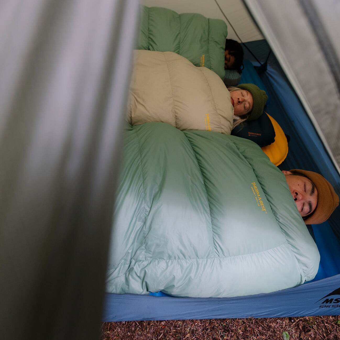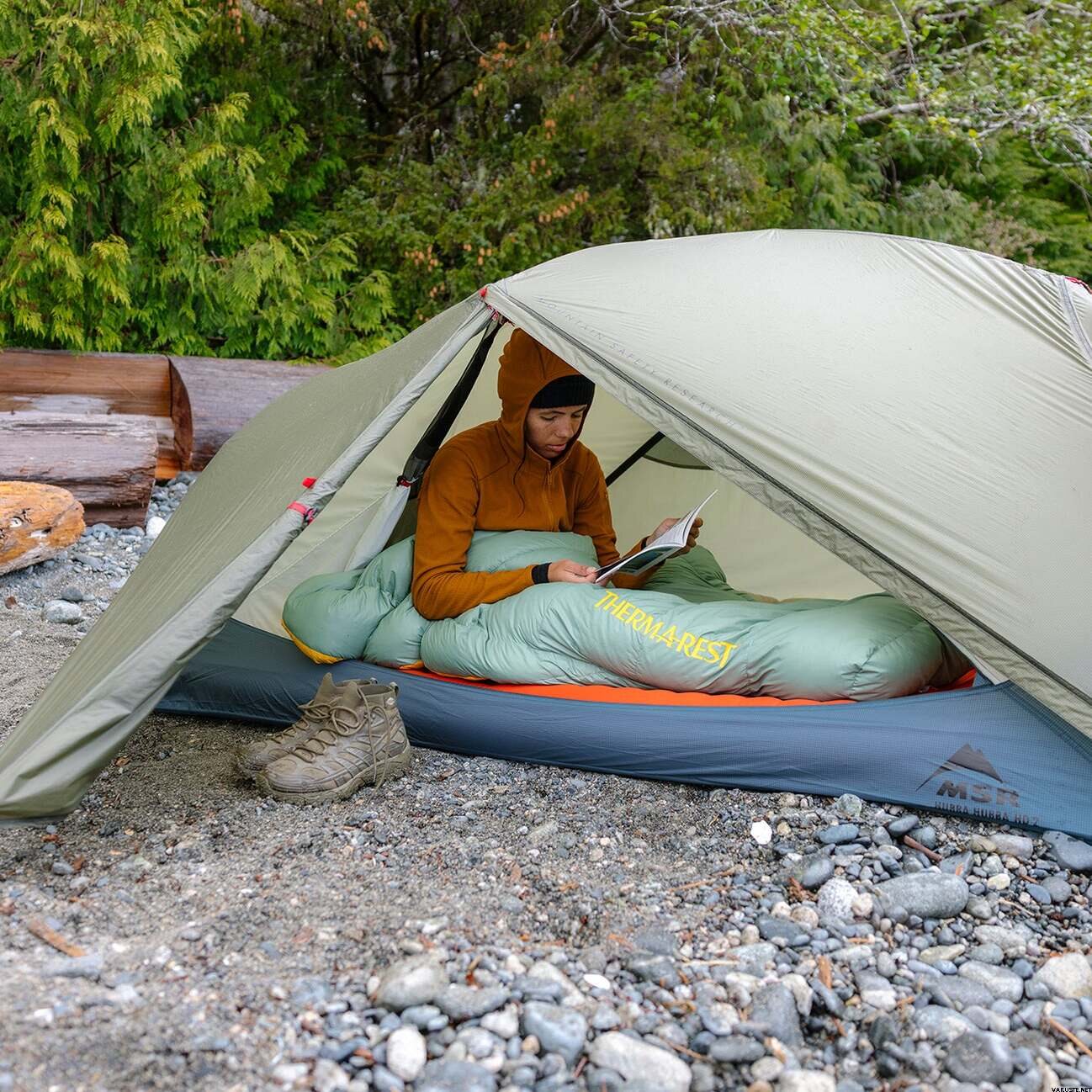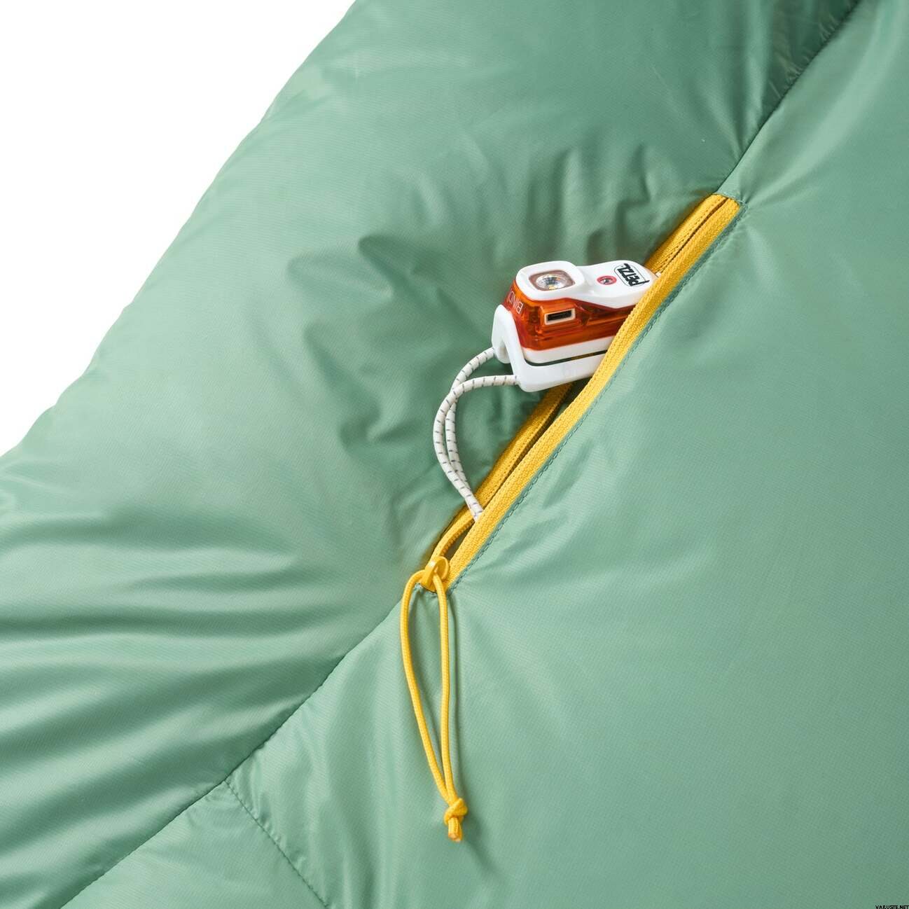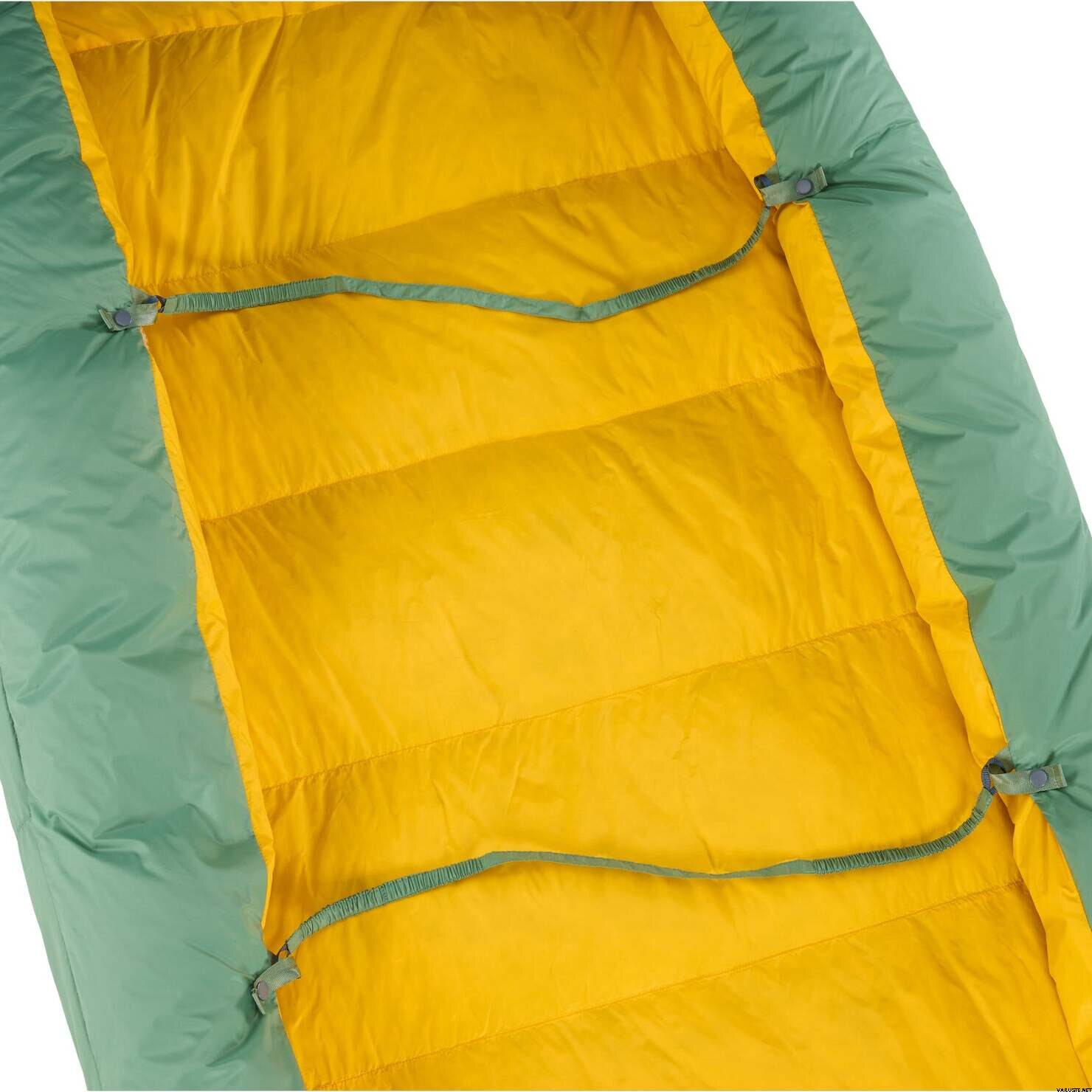 After using it a couple of times, it's a really good alternative to a sleeping bag! Nicely warm and blanket-like. In the middle, there are two elastic strings that can be pulled under the sleeping pad and fastened with a snap, so it stays in place better with the pad. There's also a snap fastener at the neck that you can put around your neck so it stays on better while sleeping. In my experience, there was no suffocating feeling at all. Comes with a compression bag and a larger bag for storage.