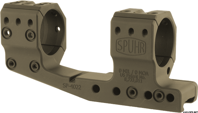 The Spuhr Ideal Scope Mount System series of mounts feature seven set of interfaces to attach any of more than 40 different accessories. The rings are diagonally cut for increased visibility of the elevation and windage turrets (US Patent 8,733,011).