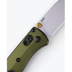 The Benchmade Mini Bugout in Woodland Green is a compact and versatile folding knife, perfect for outdoor enthusiasts. Its anodized aluminum handle scales in a rich green hue evoke the nostalgia of classic camping gear. This knife maintains the slim and ergonomic design of the original Mini Bugout, while featuring a high-quality S90V stainless steel blade with a Crushed Silver Cerakote finish. The knife is further enhanced with a touch of color from its gold anodized thumb stud and barrel spacer, making it both functional and stylish.