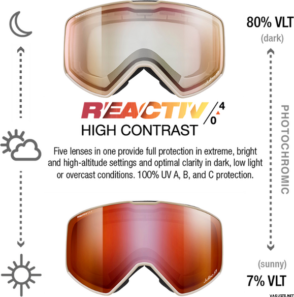 The Julbo Cyrius-X Reactiv ski goggles elevate performance with their frameless cylindrical lens, incorporating advanced Reactiv or Spectron technologies. Designed for passionate skiers, these goggles feature a double lens construction and Air Flow ventilation to effectively prevent fogging.