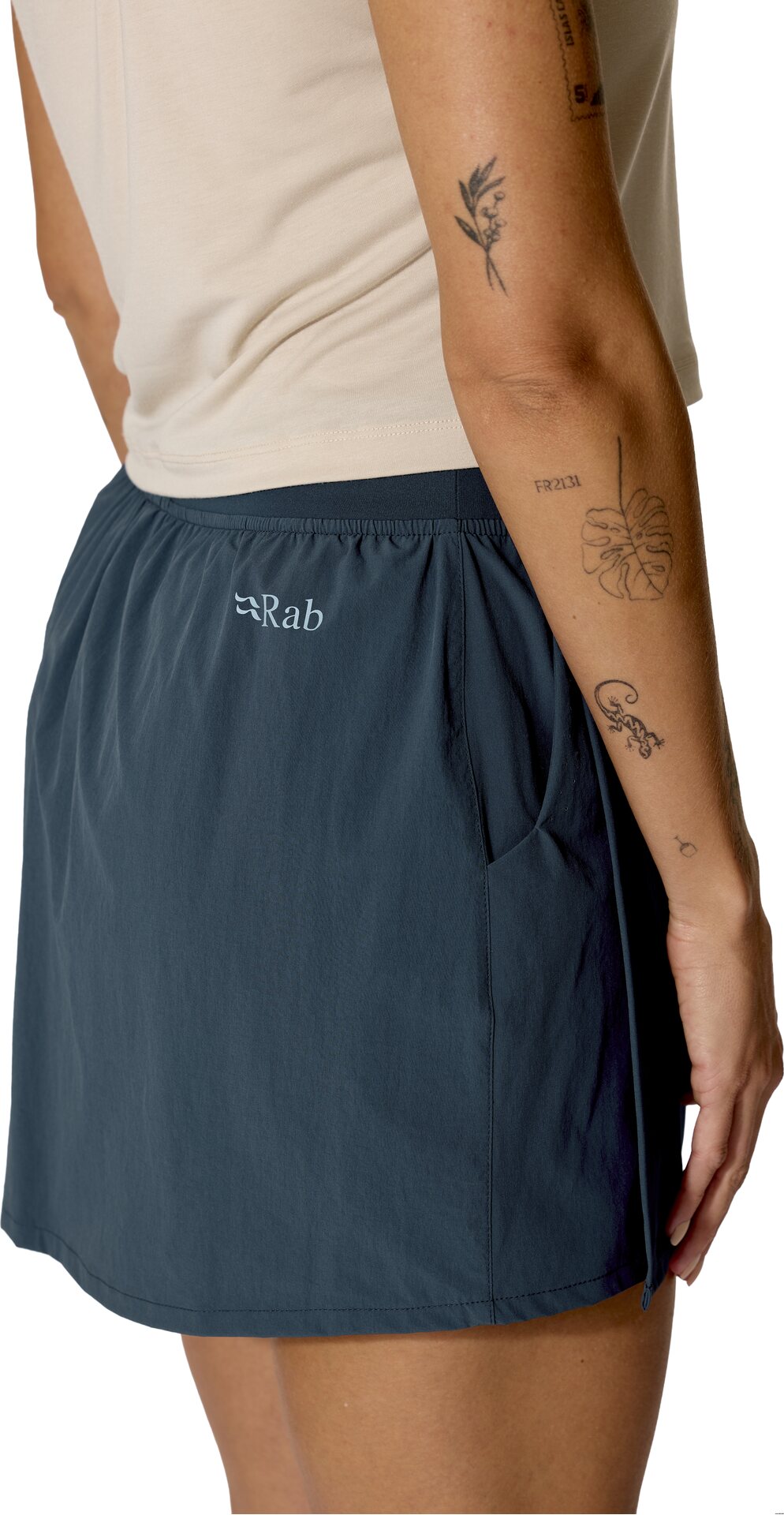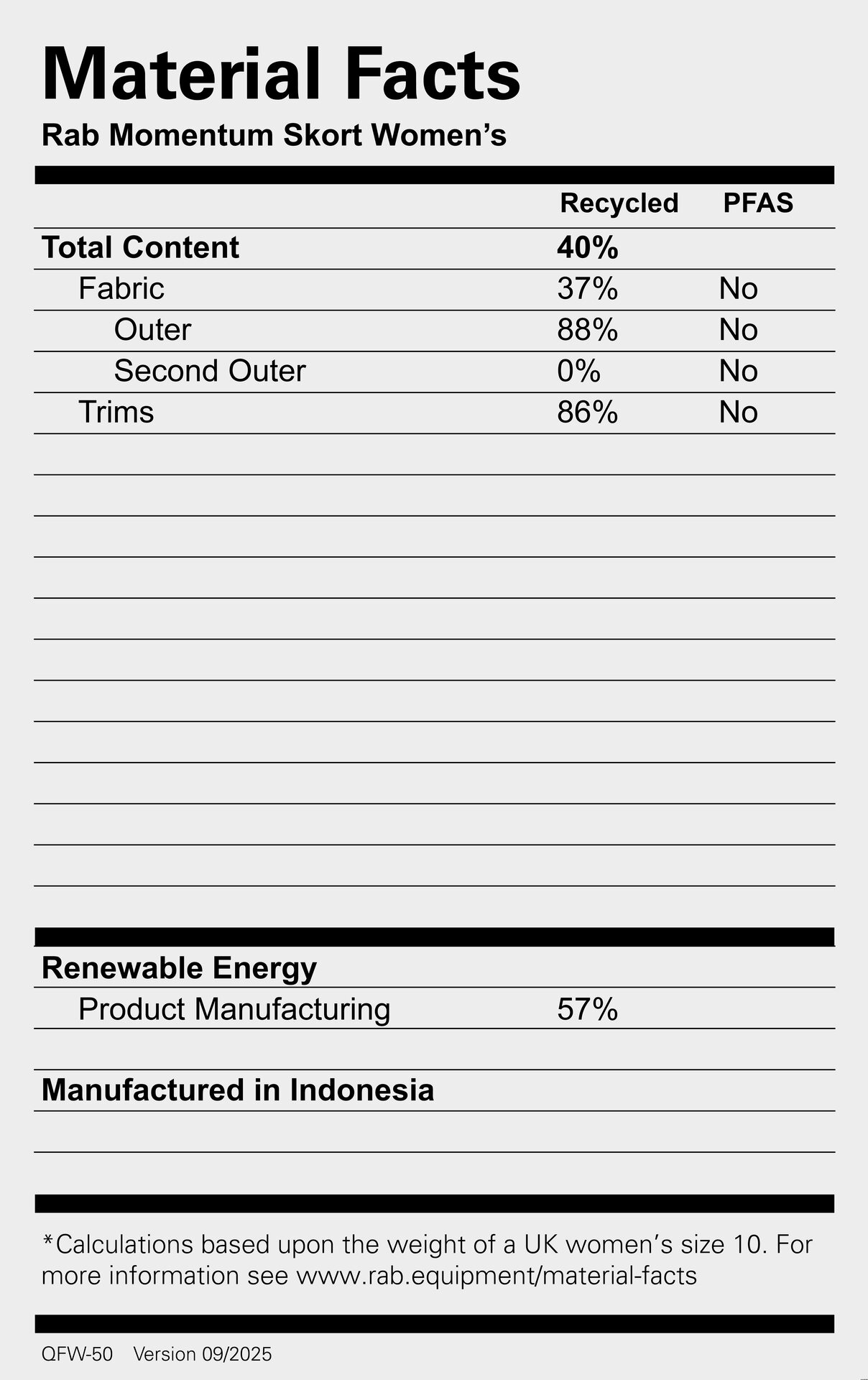 Rab Momentum Skort is a lightweight, abrasion-ready skort designed for confident movement on summer hikes and rocky trails. This skort combines a wraparound outer with supportive liner shorts, giving freedom to stride, scramble, and climb without restriction. Stretchy fabrics move smoothly with the body while maintaining a secure feel during faster sections. Practical pocketing and an adjustable waistband make it easy to keep essentials close on the go.