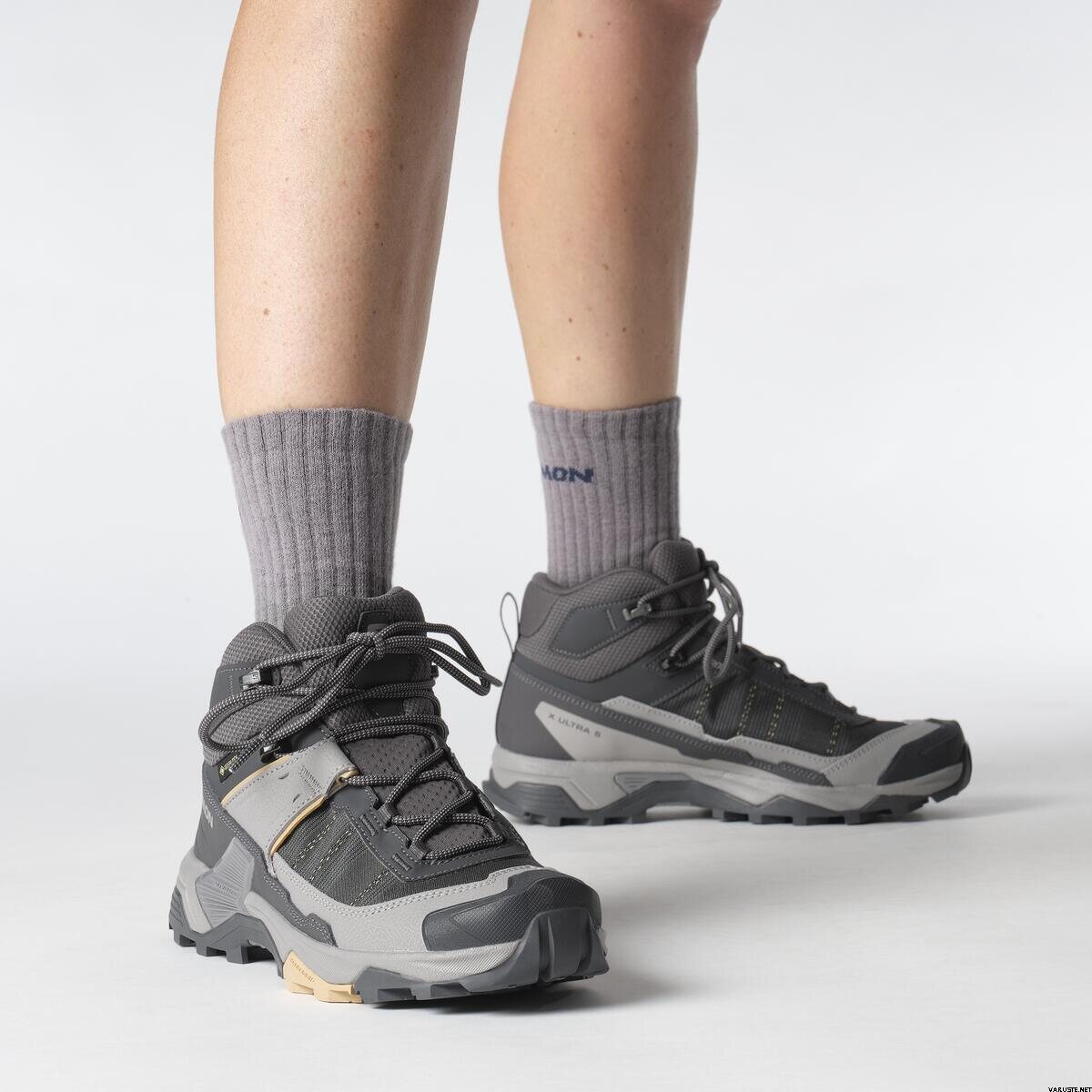 The Salomon X Ultra 5 Mid Wide GTX Womens is a dependable choice for hiking enthusiasts, offering confidence and support on the trails. These women's outdoor shoes are lightweight and stable, designed to help you ascend and descend hills with ease. Crafted for safety and agility, they feature a durable Matryx upper, a long-lasting Contagrip outsole, and a comfortable shaft for enhanced performance.