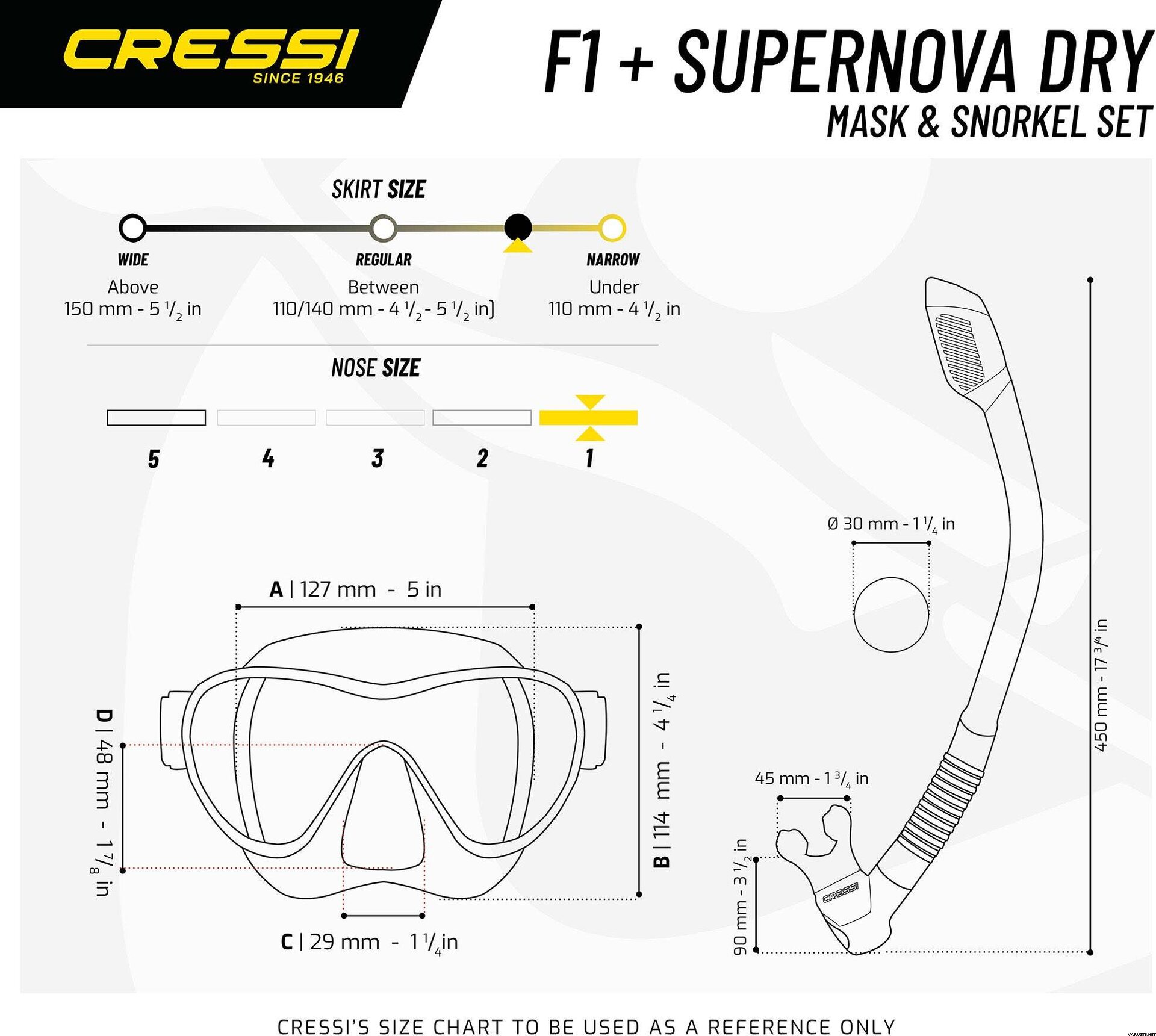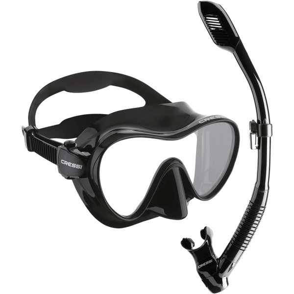 Cressi F1 + Dry stands out as a compact, travel-friendly mask and dry snorkel set designed for easy packing and dependable surface breathing. These diving masks pair a low-profile, single-lens frameless construction with a dry-top snorkel to suit everything from relaxed snorkelling to scuba sessions. With a low internal volume for simpler clearing and a valve system that helps limit water entry, the set focuses on comfort, clear sight, and smooth use in the water.
