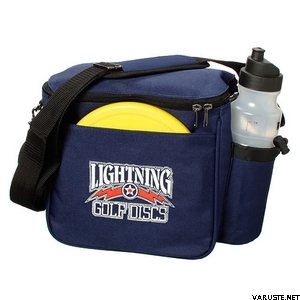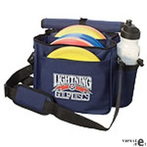 Holds 10-12 discs. Zipper pockets. Zipper pockets. Inside divider. Roll-up top. Drink holder. Adjustable padded shoulder strap with metal hardware.