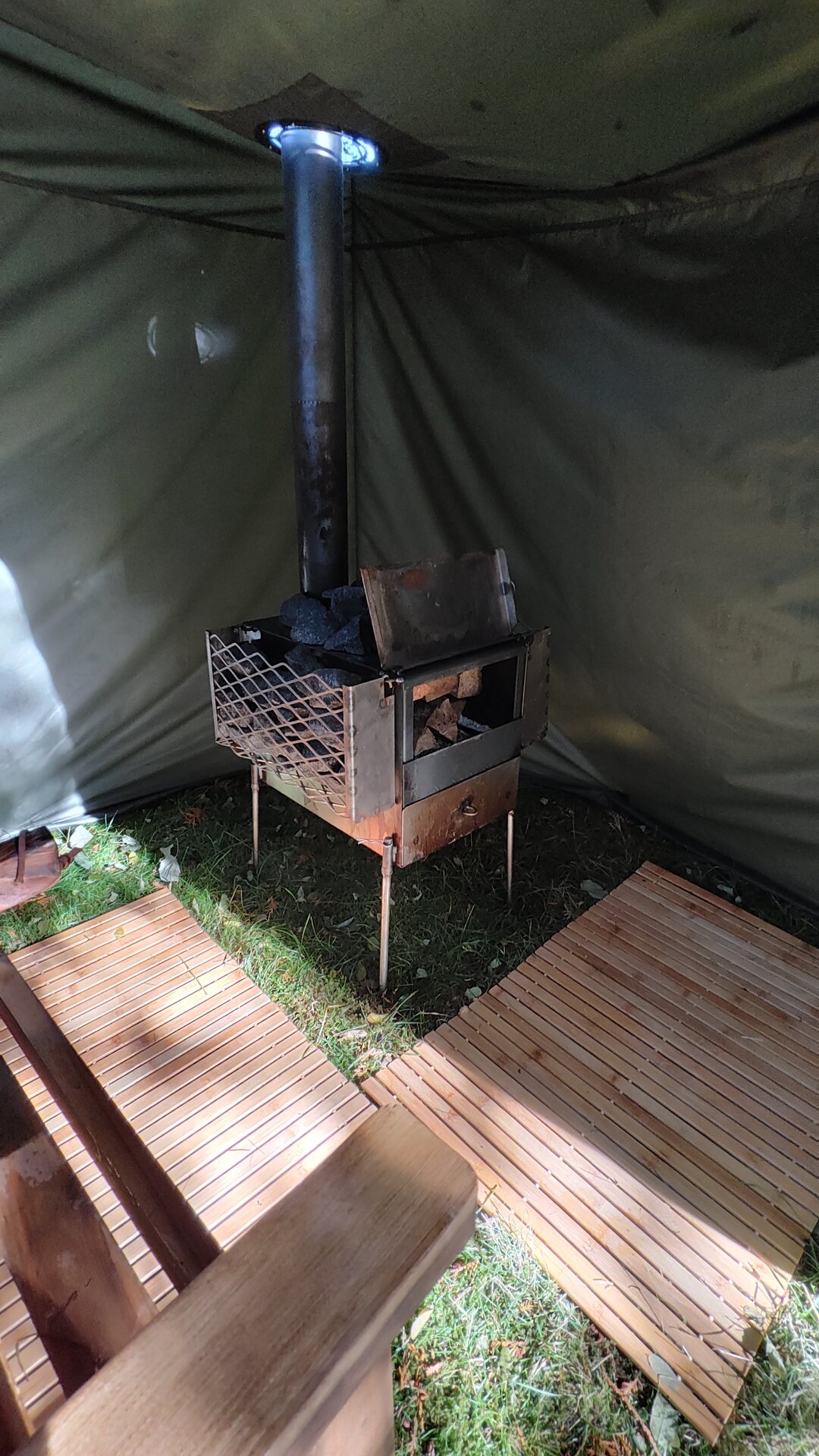 Quality material, easy to put up / clean and put away. Having looked at other similar stoves, I am really pleased how well this handles the heat and how efficient it is at burning wood. Not sure how portable it is given the weight and bulk but for me safety and quality was more important.