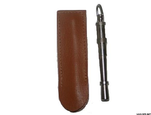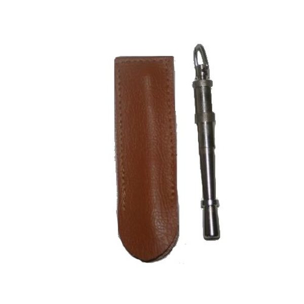 Metallinen säädettävä pyypilli. Pillin mukana tulee nahkainen kotelo ja siinä on avaimenperälenkki.