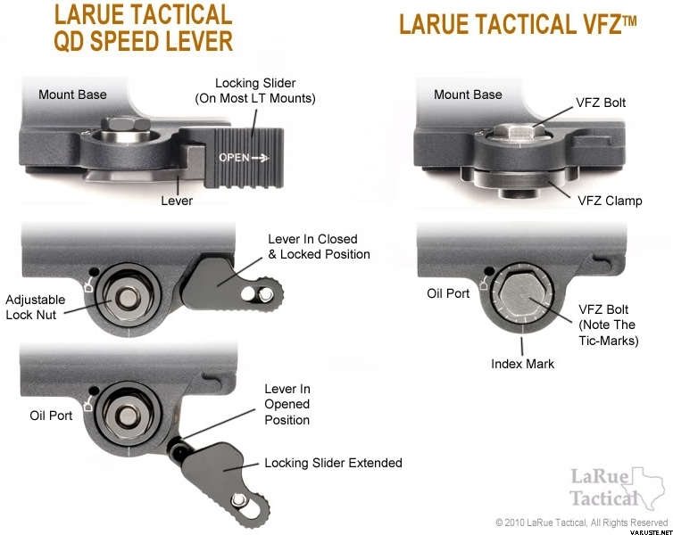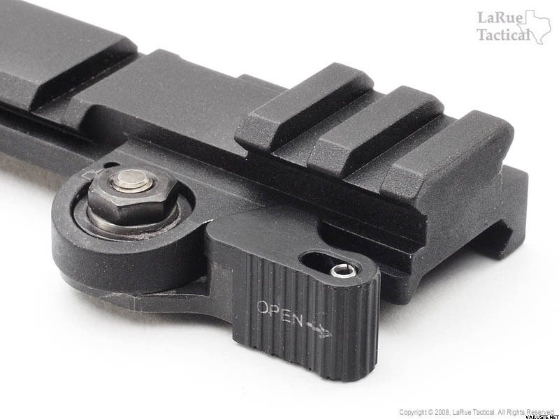 Like all LaRue mounts, it is precision-machined out of bar-stock aluminum and matt black anodized to provide a durable non-reflective surface finish. The locking LaRue Speed Lever provides outstanding return to zero; the optic can be removed, and replaced, without loss of zero. Guaranteed.