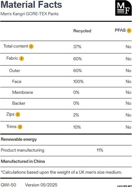 Tejido principal: Gore-Tex Performance Products 70D de 3 capas con membrana ePE y DWR sin PFCec (133 g/m²)
