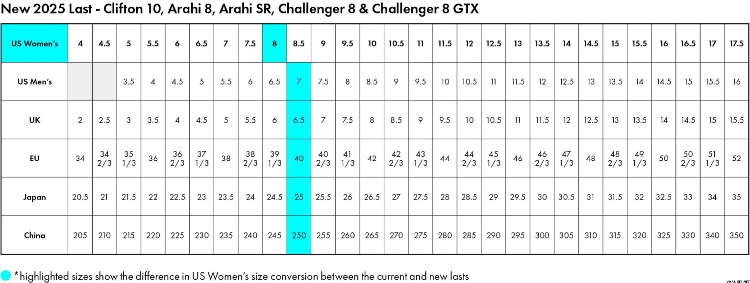 Tenga en cuenta que, en las Challenger 8 GTX para mujer, Hoka ha modificado la traducción de tallas. Las tallas estadounidenses se mantienen, pero las europeas correspondientes se han reducido ligeramente.