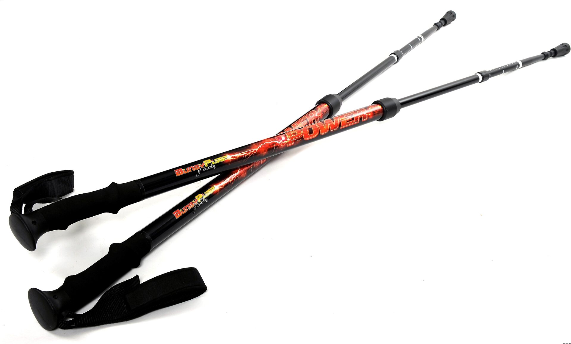 Facts BungyPump Power: Length: 115-155 cm, variable adjustable . Grip: Ergonomically designed, powerful band. Shaft upper: Durable plastic, 30 mm . Shaft, lower part: Aluminum. Tip: Carbide. Rubber foot: Natural rubber. Color: Black.