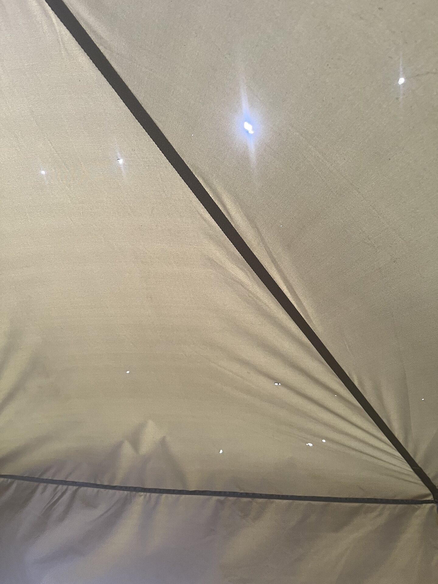 L'intérieur est suffisamment grand pour accueillir deux bancs pour deux personnes et le poêle. La fenêtre arrière offre un peu de lumière et permet de jeter un œil à l'extérieur. L'entrée est zippée et peut être enroulée et sécurisée. Un cordon est attaché au sommet du plafond, c'est un point d'attache pour un thermomètre de sauna pour vous aider à surveiller la température et à ne pas surchauffer la tente.