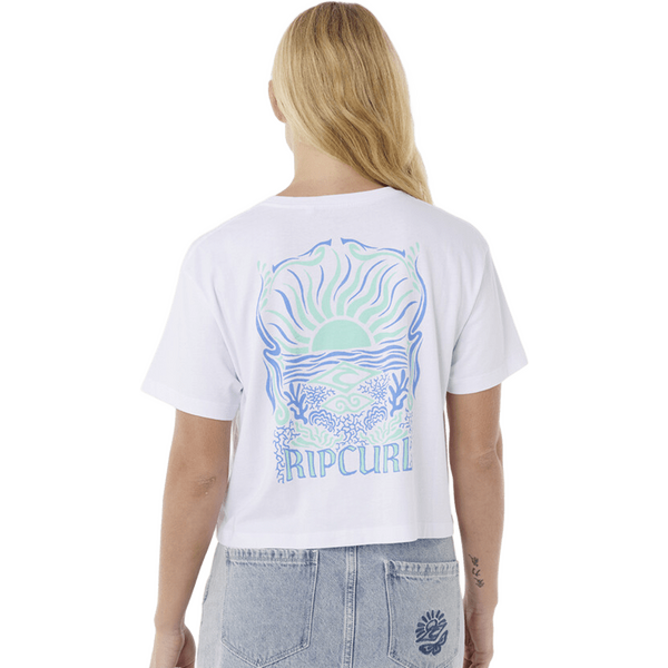 A Rip Curl Sunrise Crop Tee női póló a szörfözés utáni kikapcsolódás esszenciáját testesíti meg szögletes, rövidített dizájnjával. Puha pamut jersey anyagból készült, kőmosott felülettel a kényelmes, otthonos érzetért. Az elülső és hátsó grafika élénk hatást kölcsönöz, míg a szőtt zászlócímke és a belső nyakkivágású minta teszi teljessé a megjelenést.