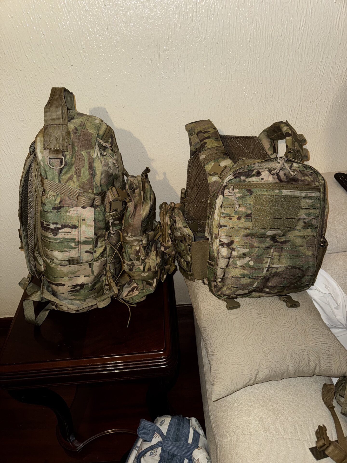 A Ghost Backpack egy 31+ literes, 3 napos csomag járőrözésre és haladó taktikai műveletekre egyaránt. Két hidratáló hólyagzsebbel rendelkezik – az egyik a fő rekeszben, a középső csőkimenettel, a másik pedig a cipzáras hátsó részben. A fő rekesz hidratáló zsebében többsávos rádiókészülékek vagy akár 15”-os laptop is elfér. A hátizsák tartalmaz egy külső zsebet egy belső rendezővel, amely lengéscsillapító zsinórokkal van rögzítve, és lehetővé teszi olyan tárgyak rögzítését, mint például esőfelszerelés vagy sisak a táska és a hátizsák közé. Ez a külső tasak levehető és külön használható, vagy bármilyen berendezésre rögzíthető a MOLLE/PALS rendszeren keresztül, és saját hordozó fogantyúval rendelkezik. A két elülső zseb ideális az apróbb és személyes tárgyak tárolására, míg a további oldalzsebek kis, lapos tárgyak tárolására alkalmasak, és kibontva kibővülhetnek, hogy elférjenek egy szabványos amerikai kantinban vagy Nalgene vizes palackban.