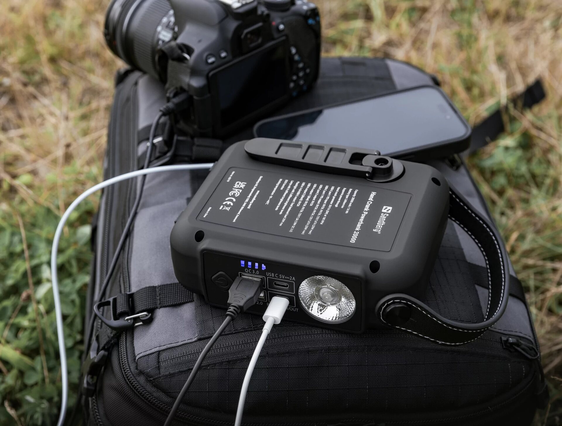 The Sandberg Hand Crank Powerbank 20000 mAh is a portable solution that provides a substantial battery capacity for charging your mobile devices on the move. Beyond its primary function of charging smartphones and tablets, it features a built-in large lamp and a powerful flashlight for added utility. When you find yourself away from a power source, the integrated hand crank allows you to manually generate electricity, enabling you to recharge the power bank by hand. The power bank also comes equipped with a convenient handle for easy carrying.