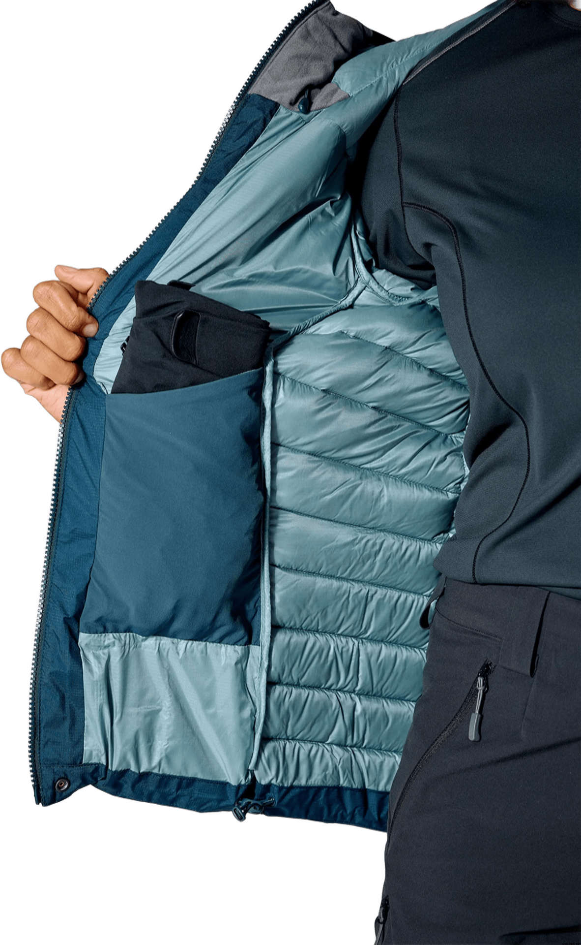 - Isolamento in piumino d'oca europeo 800FP di alta qualità con finitura idrofobica priva di fluorocarburi