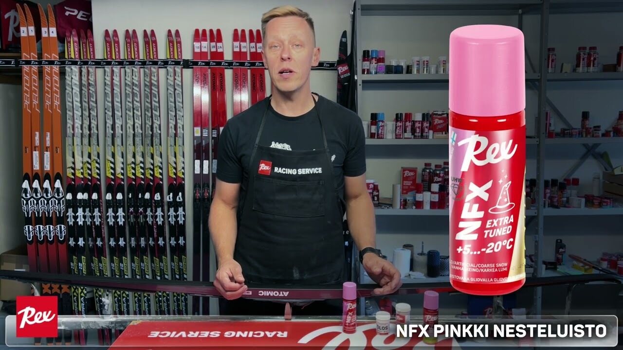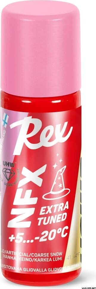 Rex NFX Pink Extra Tuned Liquid Glider +5...-20°C 60 ml è uno strato liquido ad alte prestazioni, progettato per un utilizzo ottimale su neve sporca e ruvida. Questo prodotto si basa su una versione avanzata della sciolina NF41 Pink/Green UHW, arricchita con polvere NFX41 per risultati superiori. L'aggiunta di polvere di finitura OLOS garantisce un'energia superficiale minima e una scorrevolezza ultrarapida. La sua avanzata tecnologia a nanomatrice è confezionata in un pratico flacone con spugna, che lo rende adatto come strato di finitura sulle scioline NF o come soluzione di sciolinatura indipendente sopra Glide Cleaner.