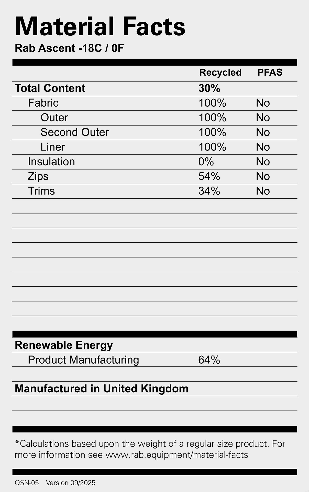 Rab Ascent -18C / 0F è un sacco a pelo invernale in piumino, pensato per chi cerca calore, comfort e praticità nelle attività all'aria aperta. Questo sacco a pelo resistente e affidabile è imbottito con piumino d'anatra 650FP e presenta un'ampia forma a mummia, che lo rende ideale per le avventure in montagna. Il tessuto antivento Pertex Quantum e l'intelligente struttura a pannelli garantiscono il massimo calore senza appesantire, perfetto per il trekking e il backpacking. Imbottito a mano nel Regno Unito, il piumino mantiene la sua morbidezza e il suo calore, offrendo un sonno confortevole anche in condizioni di freddo.