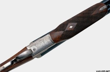 The stock and slim fore-end, made from select walnut, are finely checkered and treated with oil to enhance the beauty of the wood. The straight butt permits the application of various types of recoil pads. The extended trigger guard, wisely encased within the grip, and the oriented screws, immediately show the care and attention to the finer details that Beretta has reserved in the production of these excellent side-by-sides. One may choose from an English stock with a classic splinter fore-end or a pistol grip stock with a newly designed beavertail fore-end. Red rubber recoil pad or wooden butt plate.