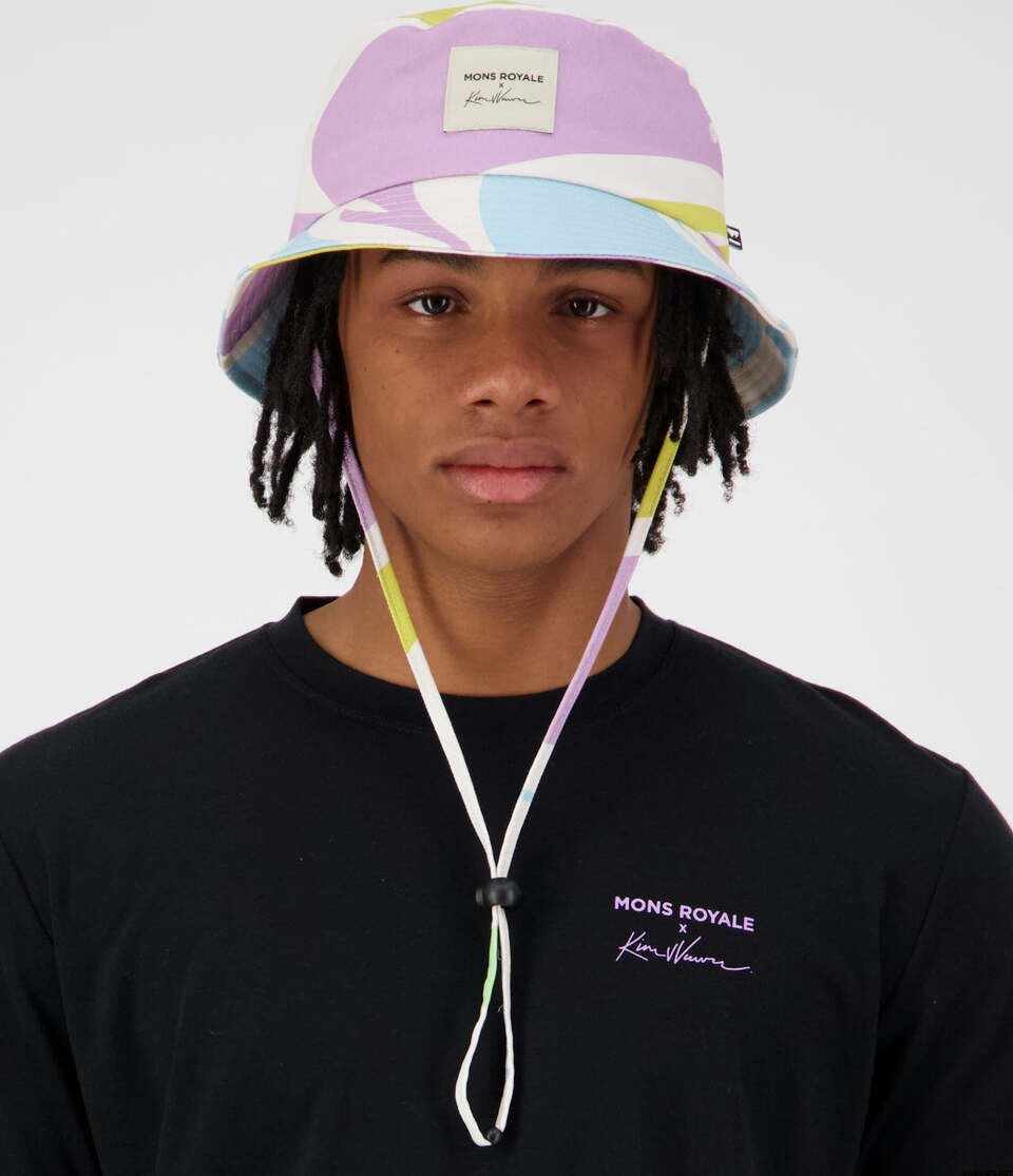 Mons Royale Larker メリノバケットハットは、個性的なアーティストプリントで際立つトレイルスタイルを演出。山でのハイキングや旅行に最適な、実用的な日差し対策も兼ね備えています。晴れて暖かい日のハイキングや旅行にぴったりのバケットハットです。