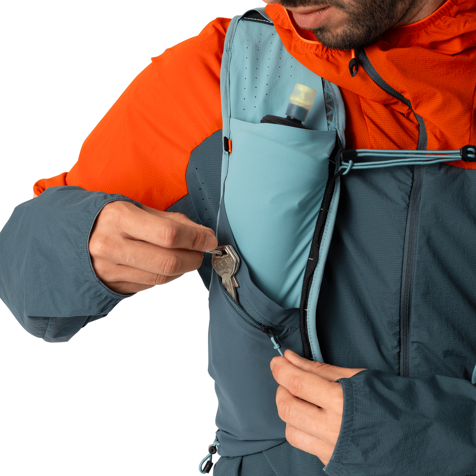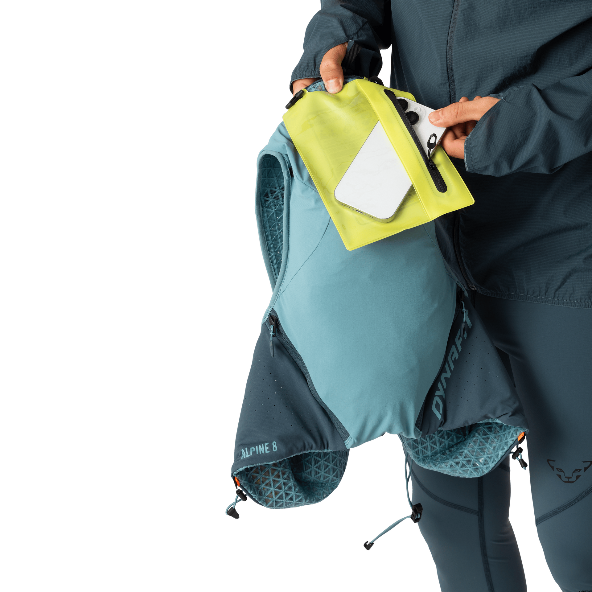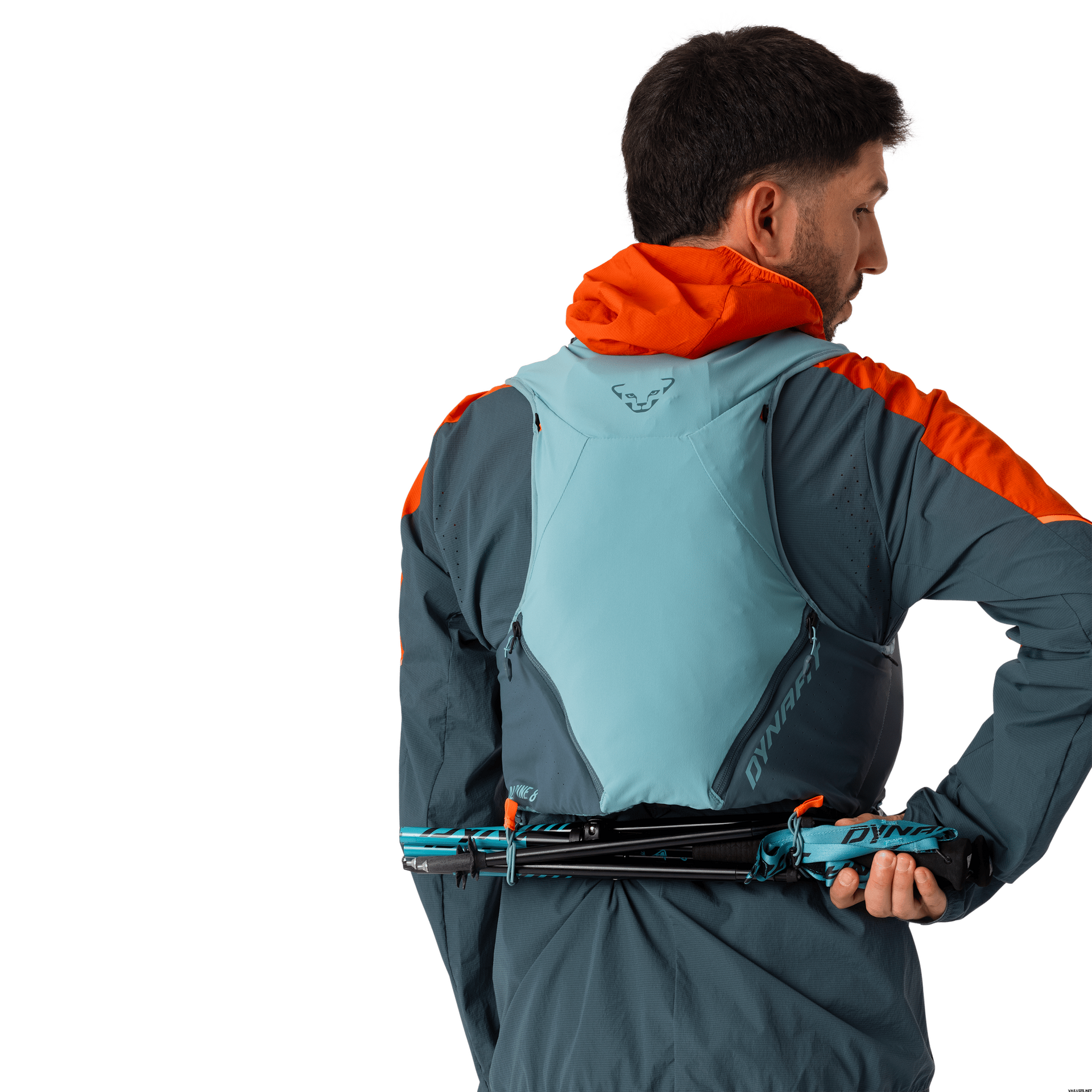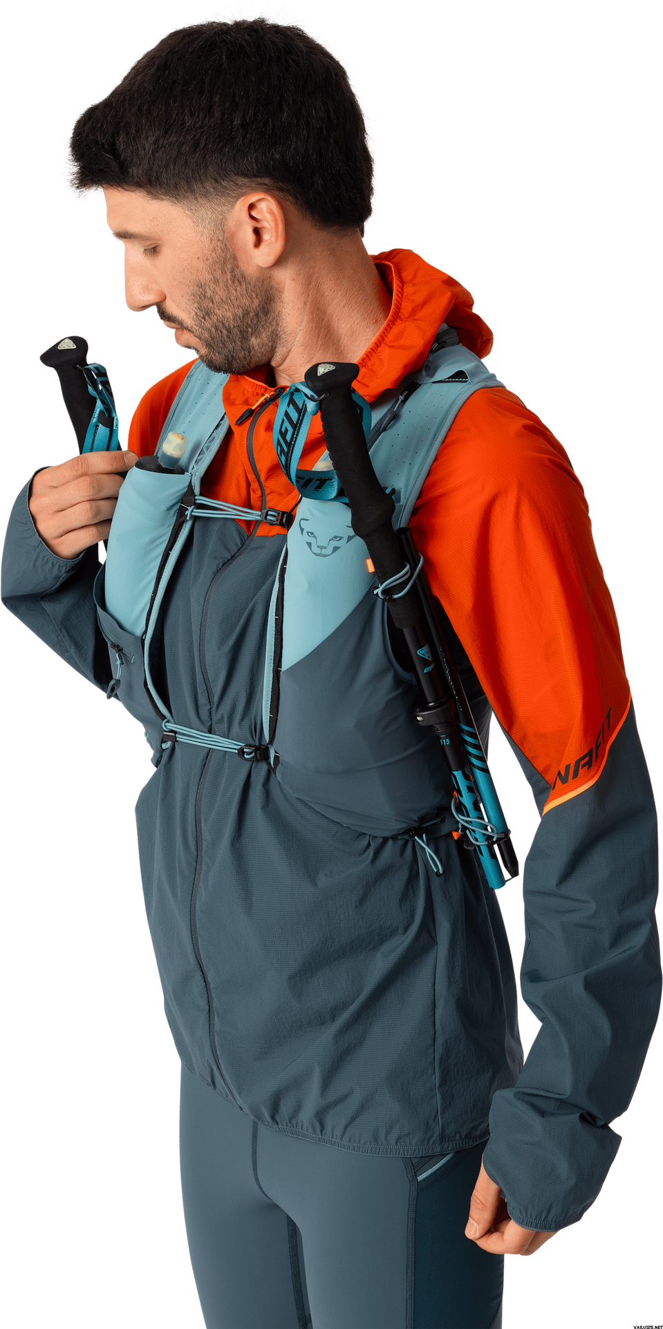 Dynafit Alpine 8 Vest er en strømlinjeformet løpevest bygget for terrengløp der rask tilgang og stabil bæring er viktigst. Denne løpevesten er rettet mot korte til mellomlange turer med et 8-liters oppbevaringsrom som holder det viktigste organisert uten at det spretter. Overlappende bakrom med glidelåstilgang gjør det enkelt å pakke og hente utstyret på farten, mens stretchlommer rundt vesten holder små gjenstander innen rekkevidde. En avtakbar vanntett lomme gir ekstra beskyttelse for verdisaker, og designet støtter også stavbæring og drikkemuligheter for lengre dager.