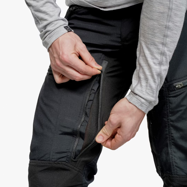Ventilaatiovetoketjut sekä reisien kohdalla että alempana lahkeissa