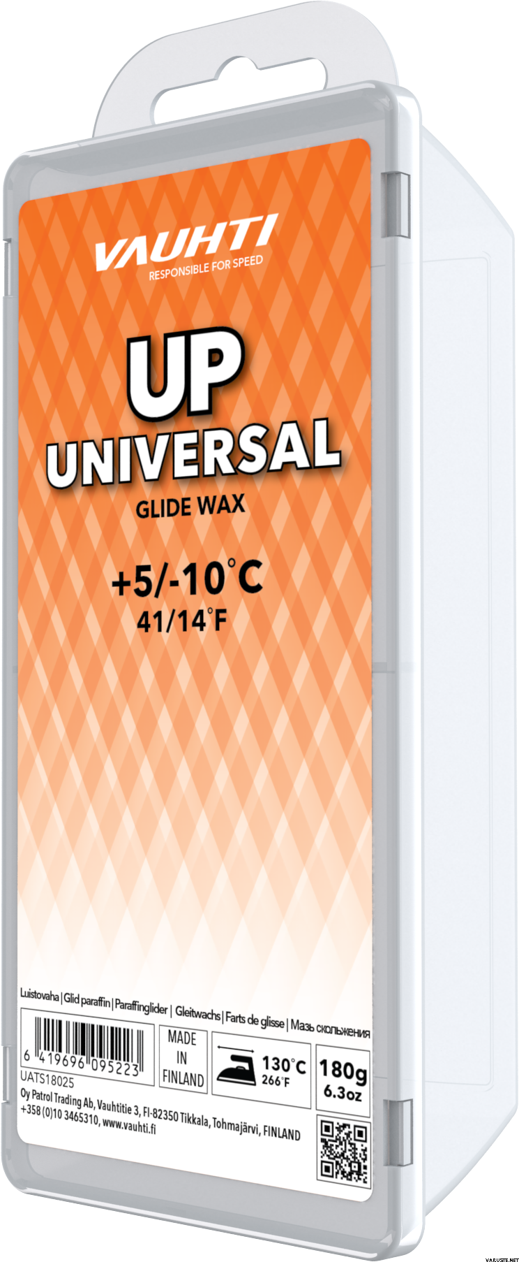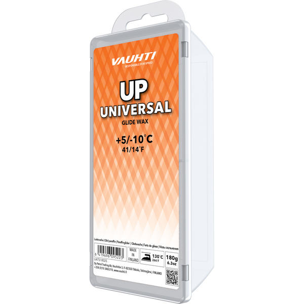 Vauhti Up Universal Orange 180g +5…-10 Glide Wax on suunniteltu hiihtäjille, jotka vaativat huippusuorituskykyä. Luistovoide sopii erinomaisesti sekä aktiivisille harrastajille että kilpahiihtäjille, tarjoten tasaisen ja tehokkaan luiston lumella. Voiteen koostumus sisältää korkealaatuisia hiilivetyainesosia, sinkkistearaattia ja silikonivahaa, taaten erinomaisen suorituskyvyn ja kestävyyden.