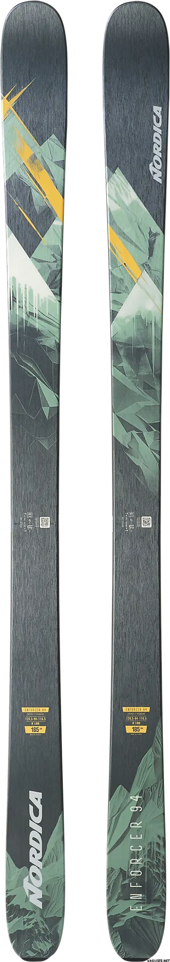 Nordica Enforcer 94 on all mountain -suksi, joka on suunniteltu keskitason ja edistyneille laskijoille. Tämä suksi on ihanteellinen valinta niille, jotka viettävät suurimman osan ajastaan rinteessä, mutta haluavat myös mahdollisuuden kevyempään offpiste-laskuun. Suksen rakenteessa yhdistyvät puuydin, elastomeerikerros, Pulse Core ja kaksi kerrosta Titanalia, mikä takaa tasaisen ja vaimennetun laskukokemuksen.