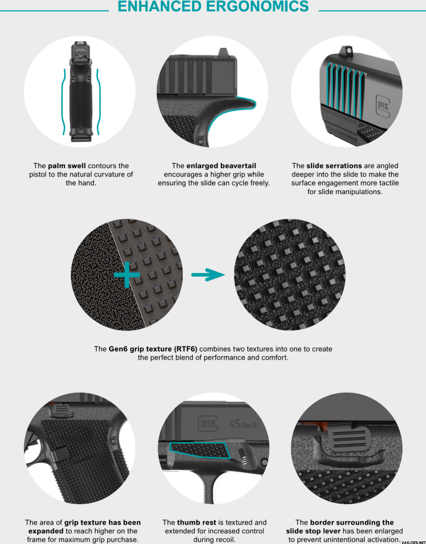 Glock 17 Gen6 on 6. sukupolven Glock-pistooli, joka on suunniteltu erityisesti ergonomiaa silmällä pitäen. Pistooli tarjoaa käyttäjälähtöisen muotoilun sopien erikokoisille käsille, ja sen tasapohjainen liipaisin tuo uudenlaisen tuntuman laukaisuun. Gen6-mallissa on myös RTF6-teksturointi, joka parantaa otetta ja varmistaa luotettavuuden kaikissa olosuhteissa. Optic ready -valmius mahdollistaa erilaisten punapistetähtäimien kiinnittämisen suoraan luistiin mukana tulevien adapterilevyjen avulla.