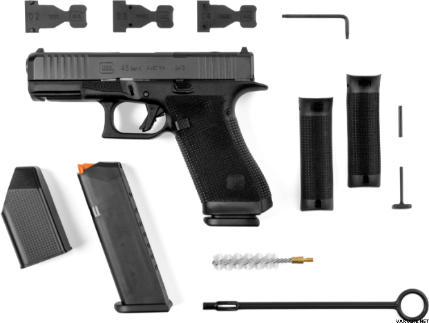 Glock 49 GEN6, 2 lipasta, latausavustin, puhdistussetti (puikko, lapunpidike ja harja), käyttöohje, kuljetus- ja säilytyskotelo, backstrap-setti ja adapterilevyt optiikoille (02 Trijicon/Holosun/Ameriglo, 03 C-More, 04 Leupold/EOTECH)