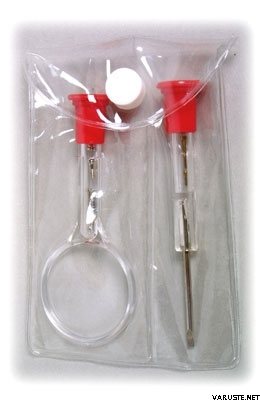 Tuotteen kuvausKorjaussarja silmälaseille. Sisältää ruuvimeisselin, suurennuslasin ja 12 ruuvia. Ruuveille on säilytysrasia työkalujen kahvoissa.