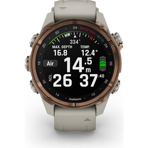 Smartwatch: Up to 10 days (4 days always-on) Battery saver watch mode: Up to 12 days GPS Only: Up to 28 hours (22 hours always-on) All Satellite Systems: Up to 20 hours (16 hours always-on) All Satellite Systems + Multi-band: Up to 17 hours (14 hours always-on) All Satellite Systems + Music: Up to 6 hours Max Battery GPS: Up to 44 hours Expedition GPS: Up to 10 days Dive mode: up to 30 hours Dive Mode with Air Integration: Up to 15 hours |