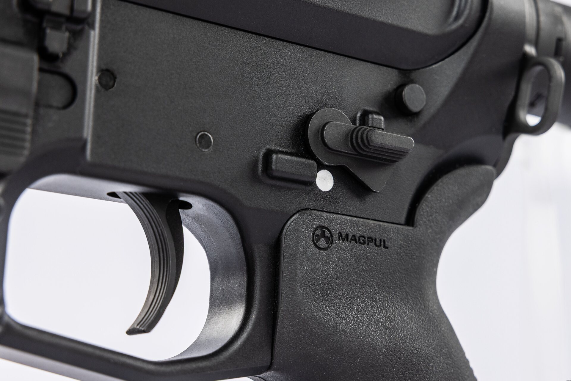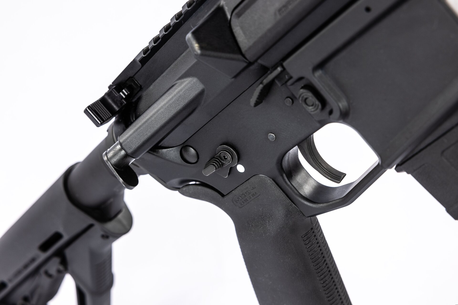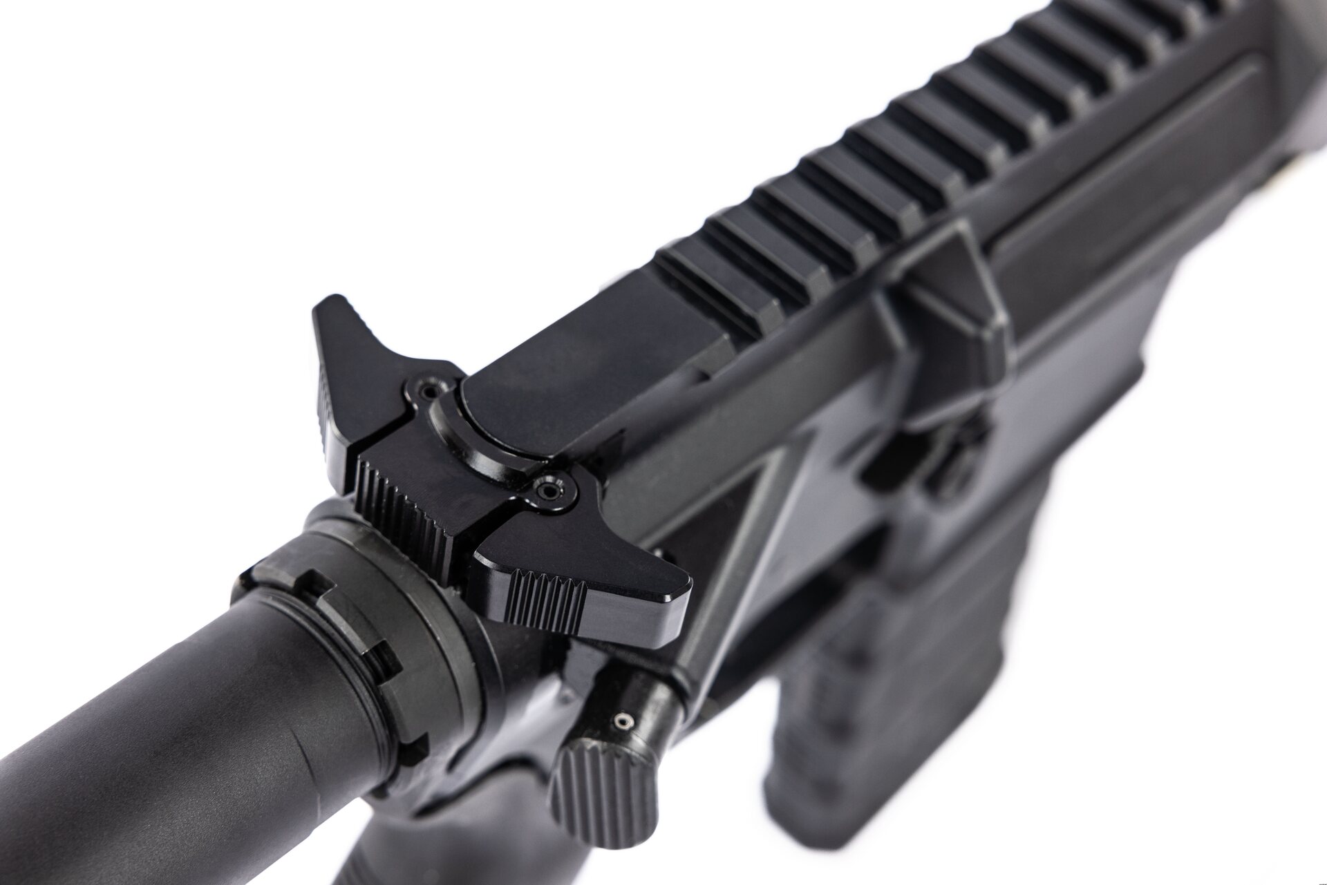 Całkowicie oburęczny bezpiecznik, rączka przeładowania i zwalniacz magazynka.
