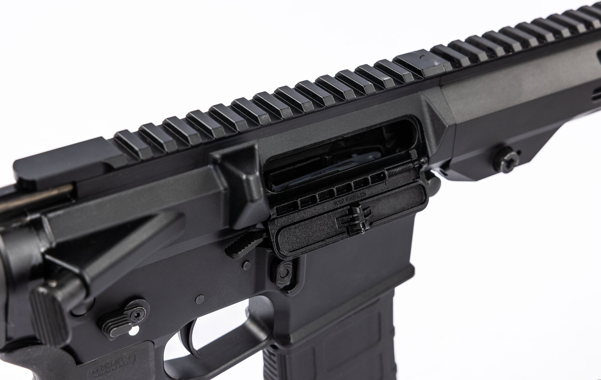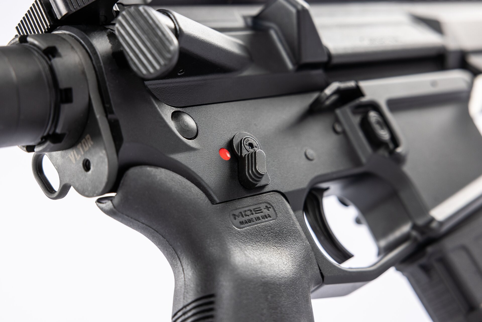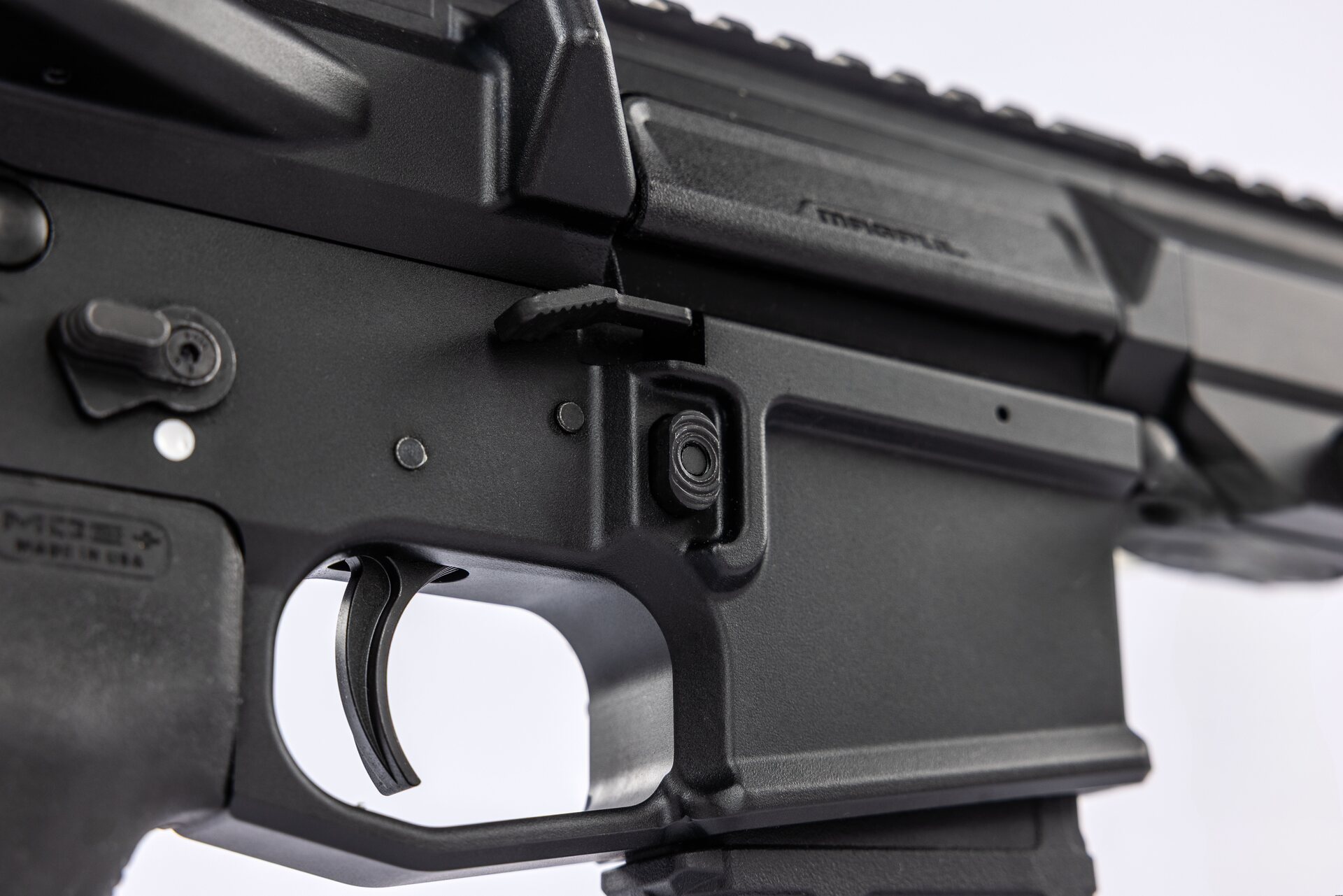 Całkowicie oburęczny bezpiecznik, rączka przeładowania i zwalniacz magazynka.