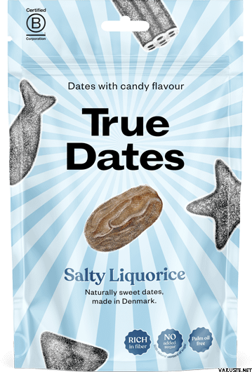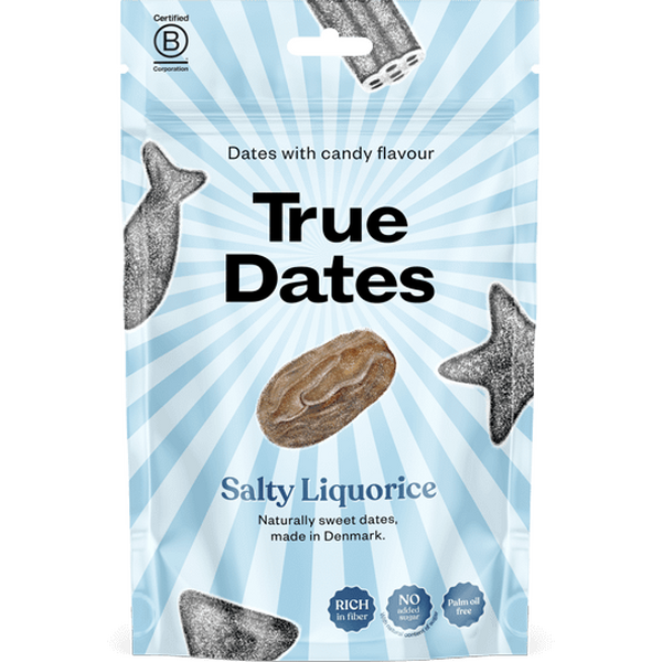 True Co. True Dates Salty Liquorice 100 g to wyrazisty, słony akcent lukrecjowy w naturalnie słodkich daktylach, dający bardziej wyrazistą interpretację klasycznego połączenia smaków. Te daktyle to przekąska idealna dla miłośników lukrecji, którzy szukają czegoś innego niż zwykłe słodycze. Świetnie sprawdzą się na szybką zachciankę w podróży, w biurze lub jako drobna przekąska do kawy.