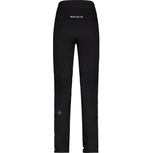 This lightweight hybrid softshell combines good weather protection through the Stormshell Light front with high wearing comfort. The knees are anatomically shaped, the high elastic waistband and the back made of elastic, breathable Skin Stretch wears very comfortably, whether cross-country skiing or other outdoor adventures. The zipper leg cuffs extend the range of use. Maloja lettering across the bottom and on the left thigh, all over prints on the front of the legs.