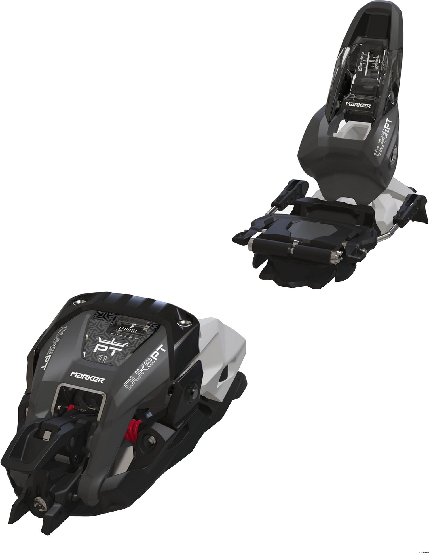 THe Duke PT 11 with a DIN 3-11 combines the performance of a Squire with comfortable uphill properties of a pin binding. For walking mode the upper part is simply unlocked and tilted forward, uncovering the pin binding. To save swing weight the upper jaw part can be taken off and stored in a backpack. The multi functional Lock & Walk unit automatically locks the brakes and provides a 10° climbing aid. For downhill mode the front jaw section is clicked back onto the base plate, quadruple secured by the Auto Quad Lock technology. The heel is the latest generation of Inter Pivot heels. The low height of 24 mm allows for direct power transmission and fast edge changes.