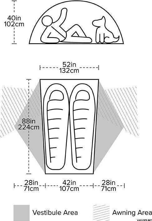 Rainfly + Floor: Tehnologie brevetată Hyperbead a materialului; nailon ripstop 15D cu grilă ripstop vopsită în soluție 20D și grad de impermeabilitate de 1500 mm, fără PFAS adăugat intenționat